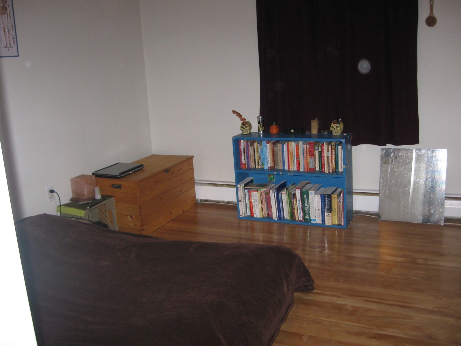 Look at that beauty! Ok, the shelf is hideous and it looks weird all bare like that, but I'm excited the junk is gone. The cardboard box on the second shelf is actually empty, but it's a nice box so I will eventually put stuff in there that needs a home. The big pile o' papers on the floor in front of it is the humongous pile of shit I didn't need to keep anyway, and noted dreams and projects that if I want to get to in the future I can damnwell begin anew.